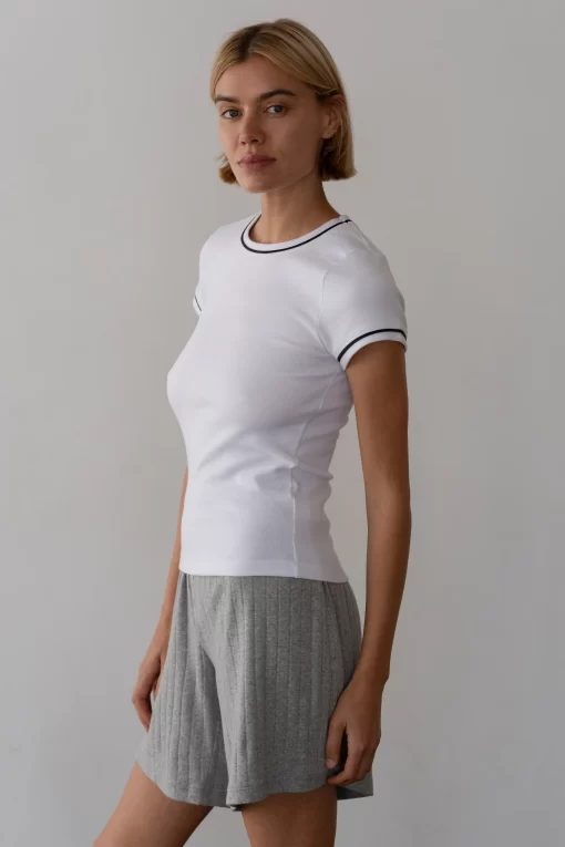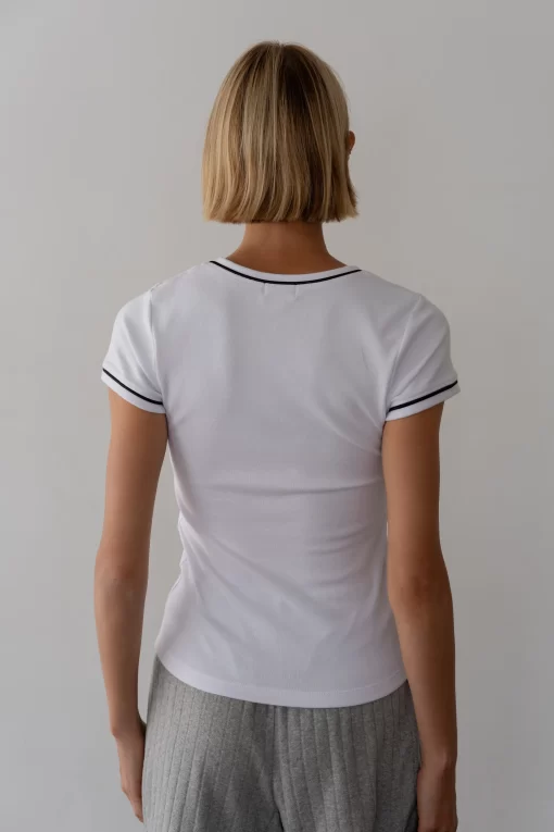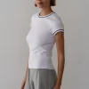 The Baby Rib Contrast Tee is crafted from our butter-soft baby rib fabric, featuring contrast trim at the sleeves and neckline, short sleeves, fitted silhouette, and a full-length cut.