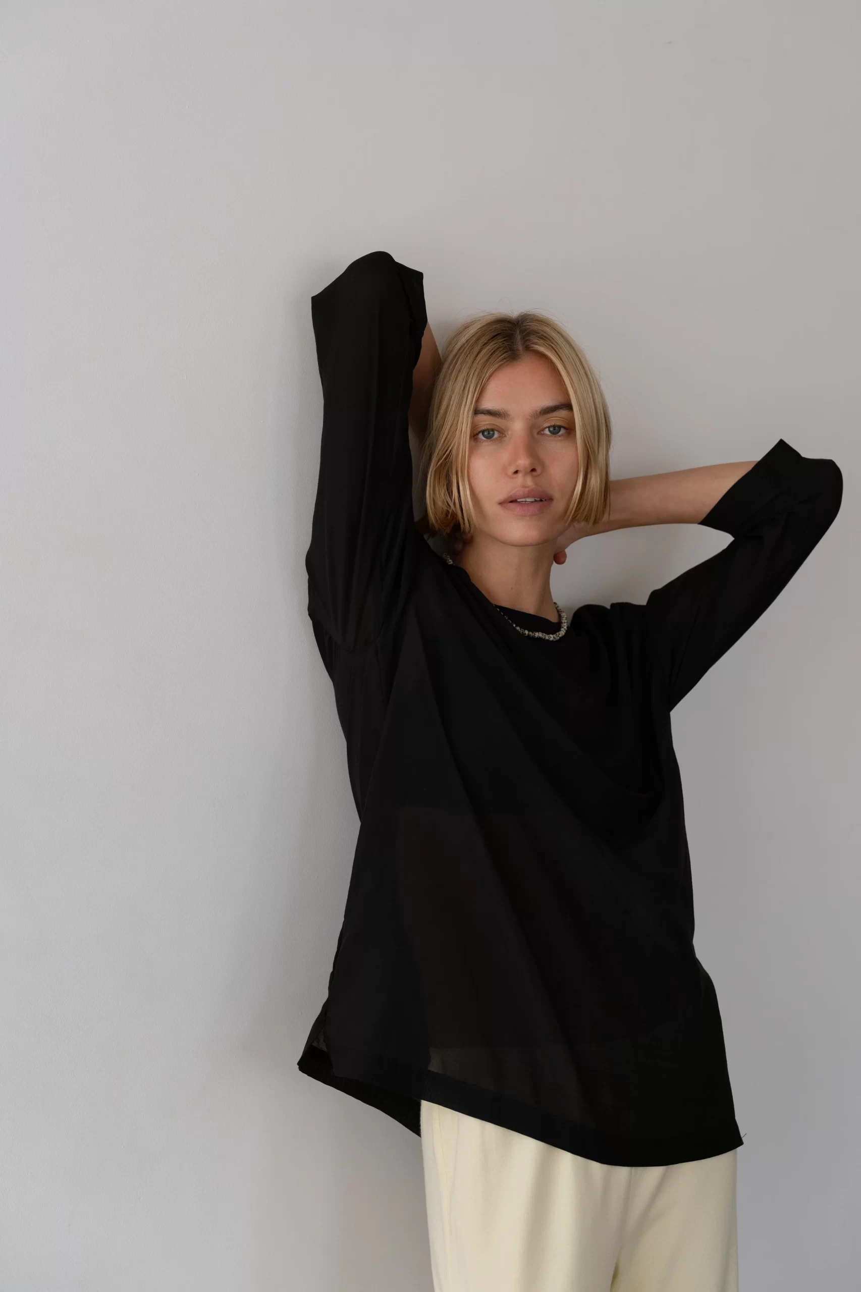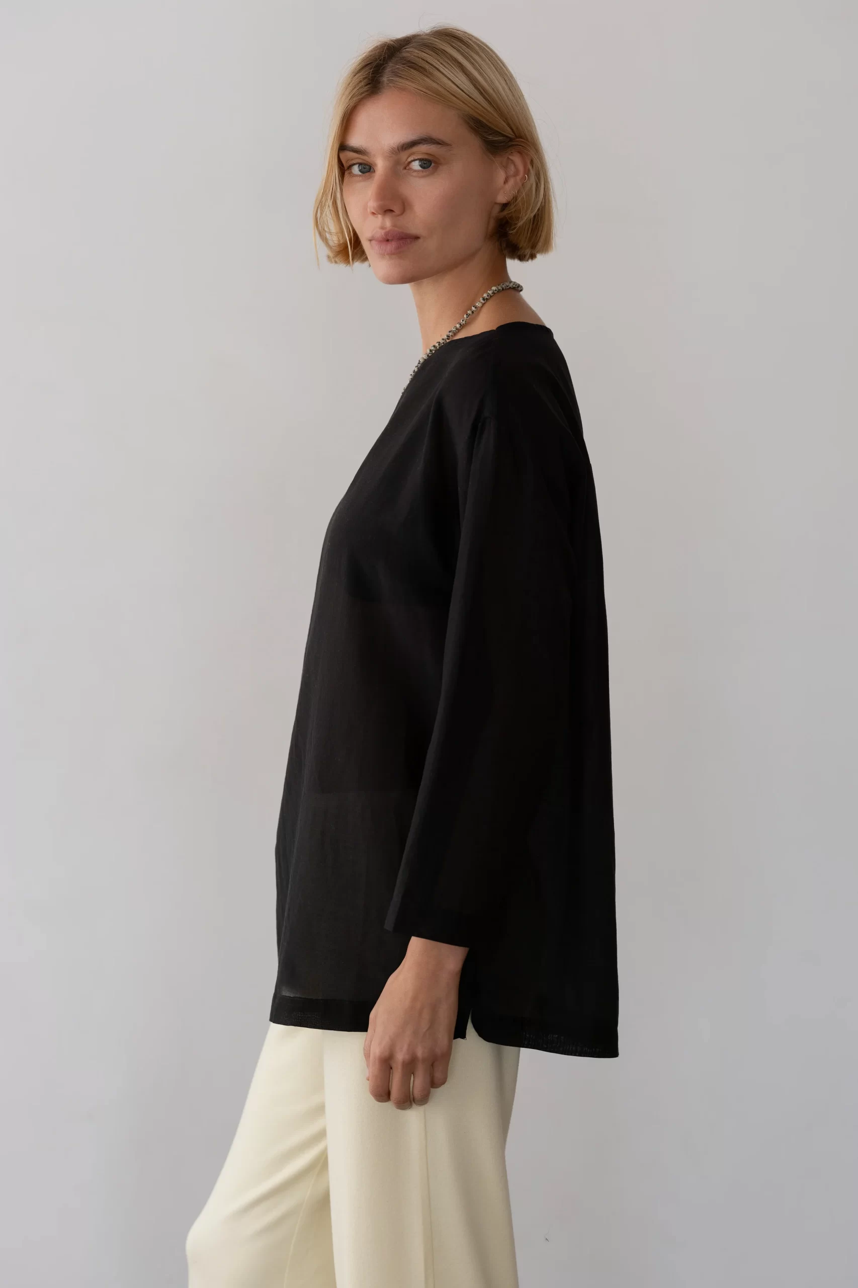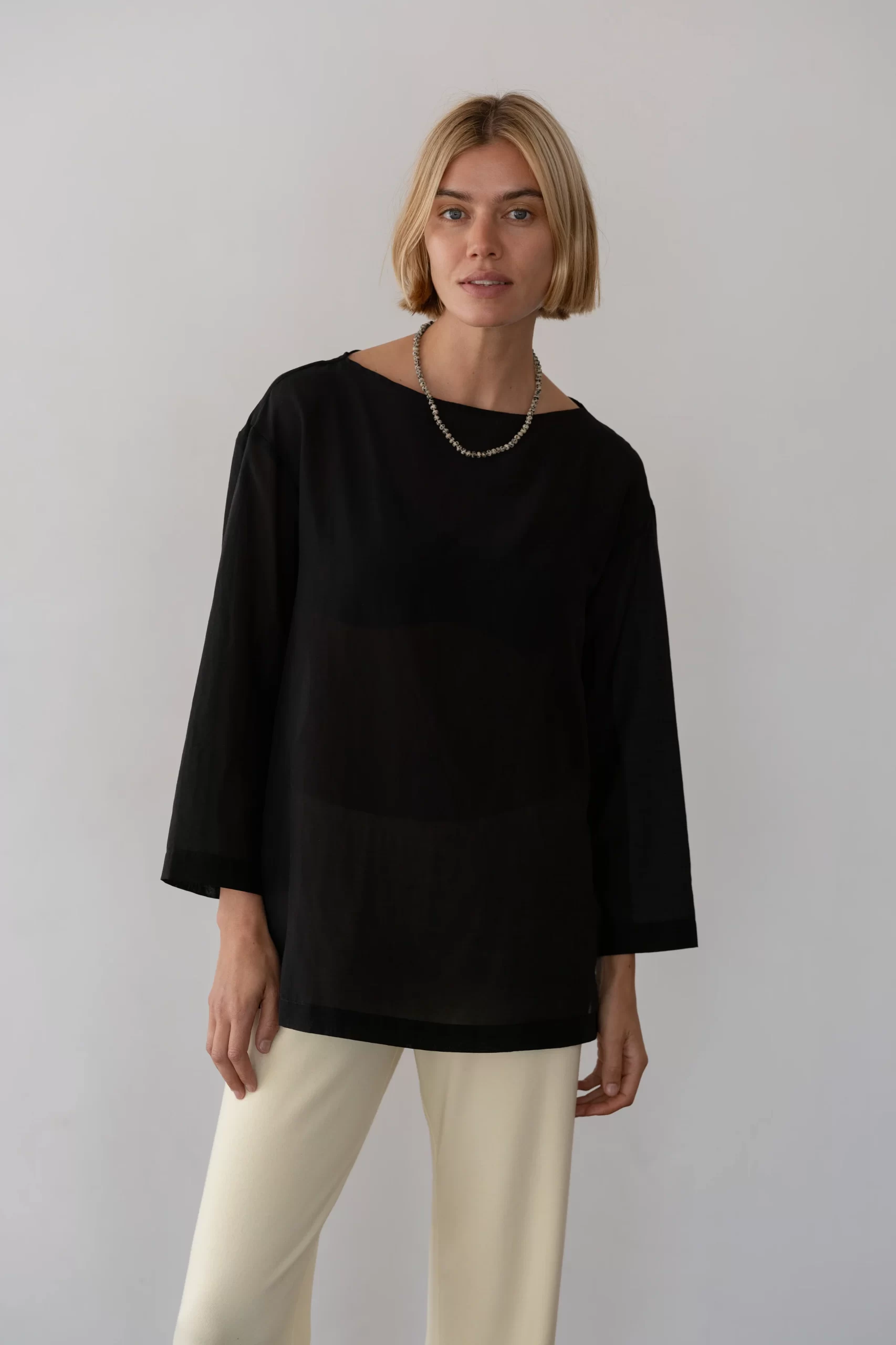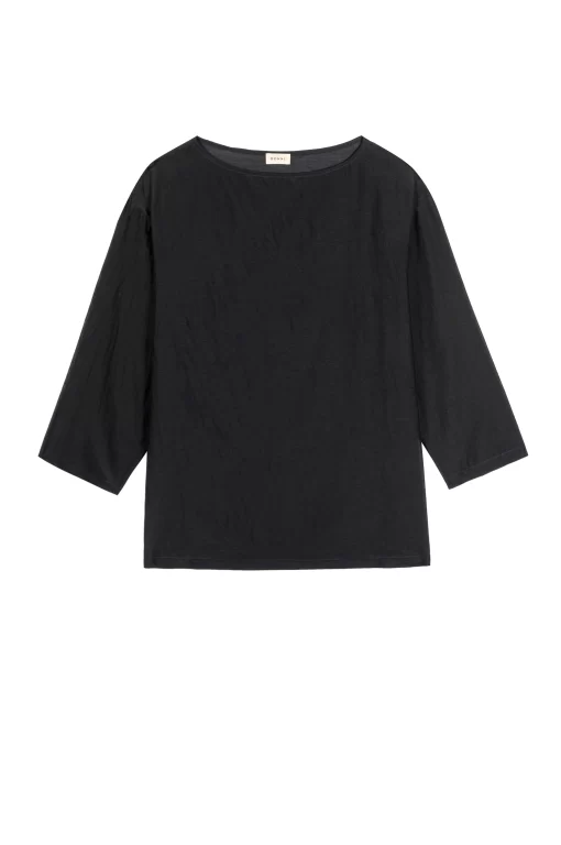 The Silk Cotton Sheer Boatneck is crafted from our airy silk cotton blend and features a relaxed silhouette with a classic boat neckline and softly draped ¾ sleeves.