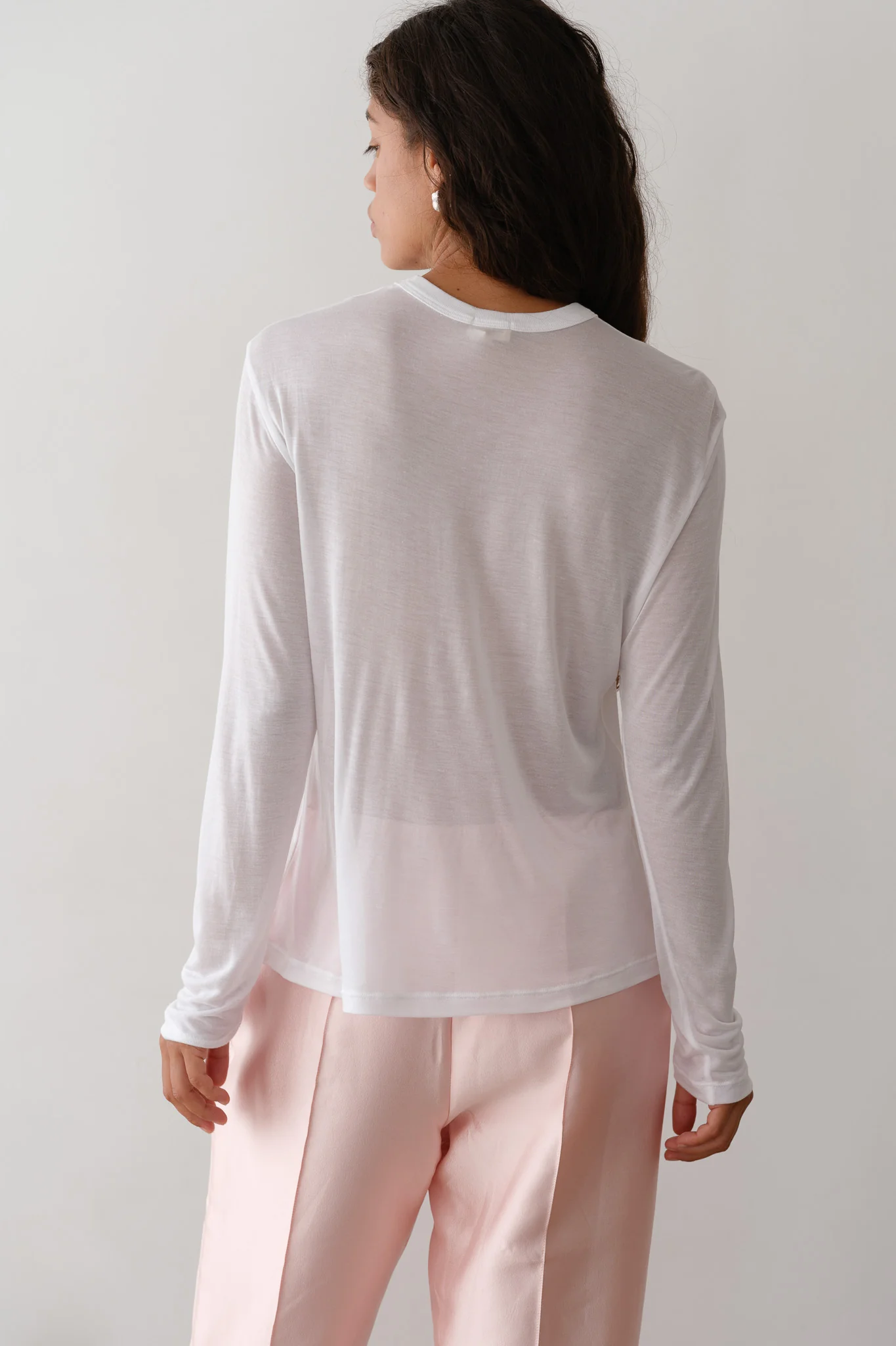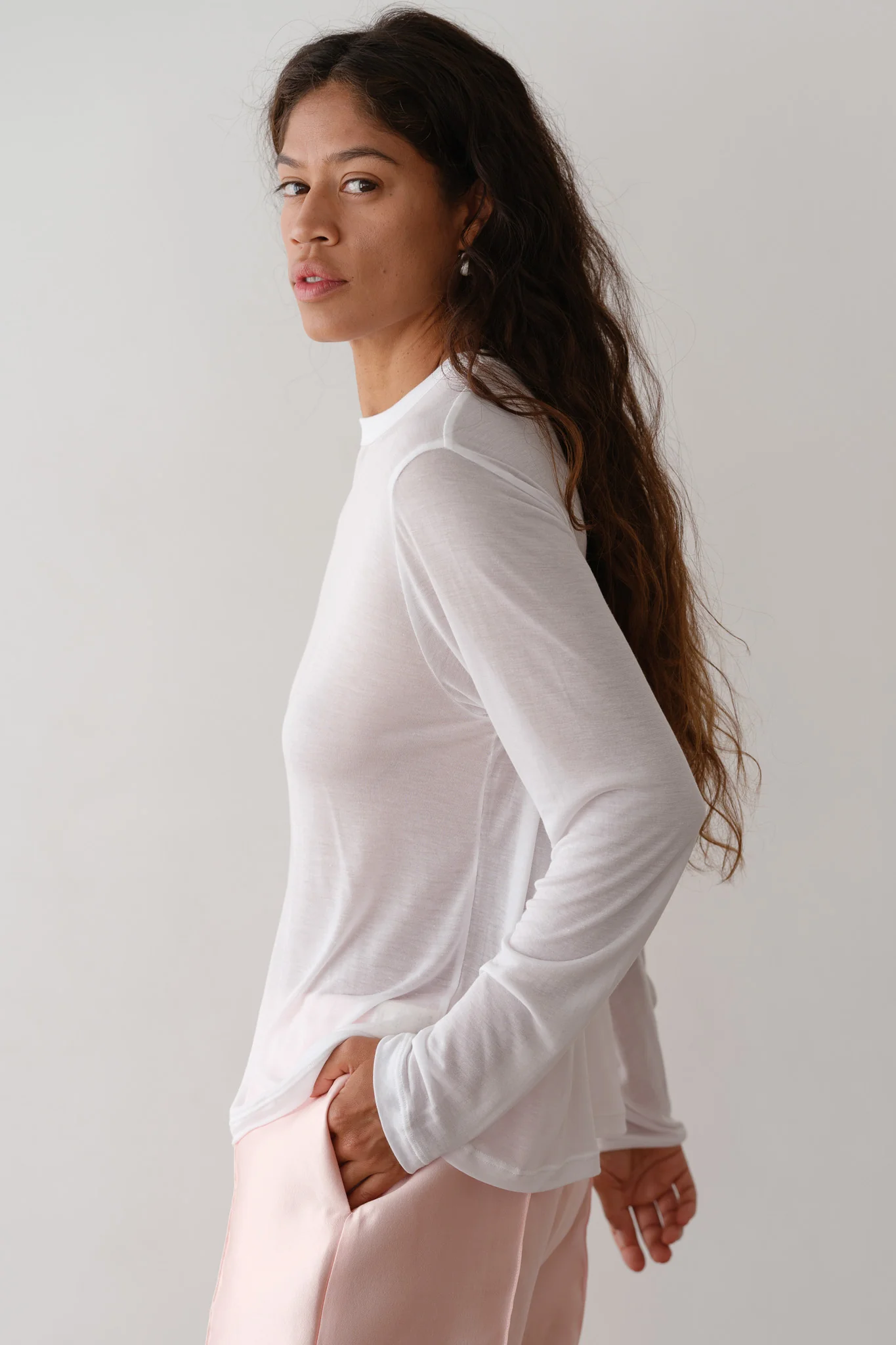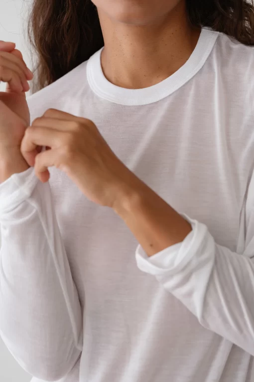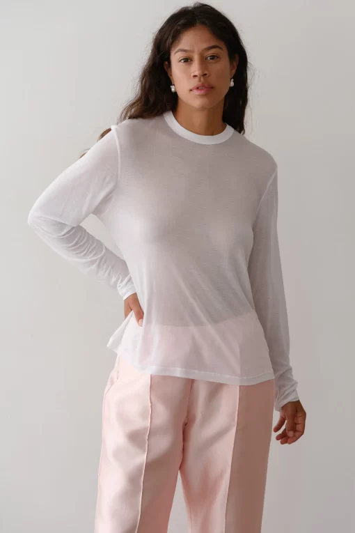 The Silk Jersey Long Sleeve is crafted from a luxe silk blend. Featuring a sheer finish, relaxed fit, and solid neckline. Perfect for layering or wearing on it's own.
