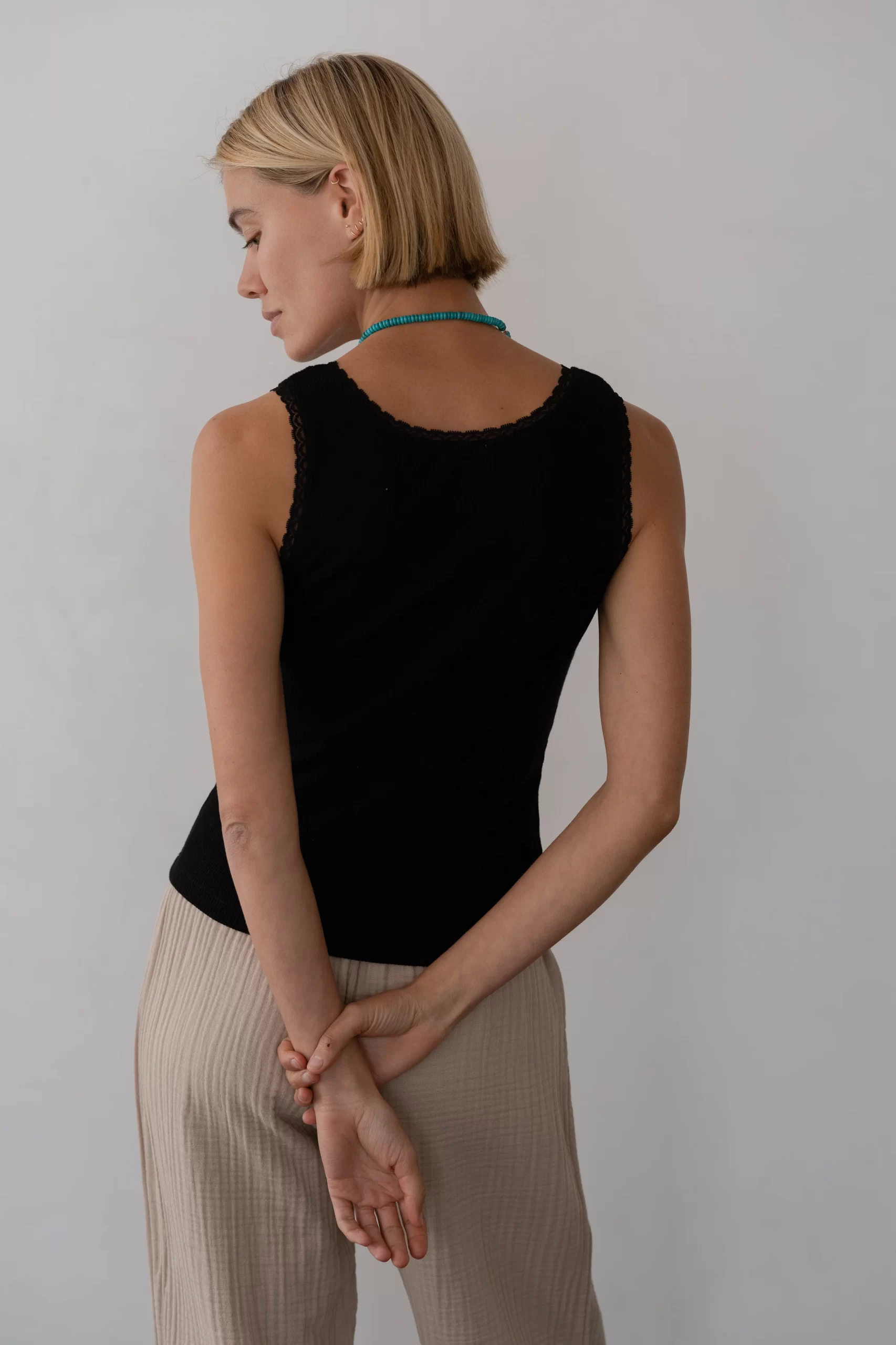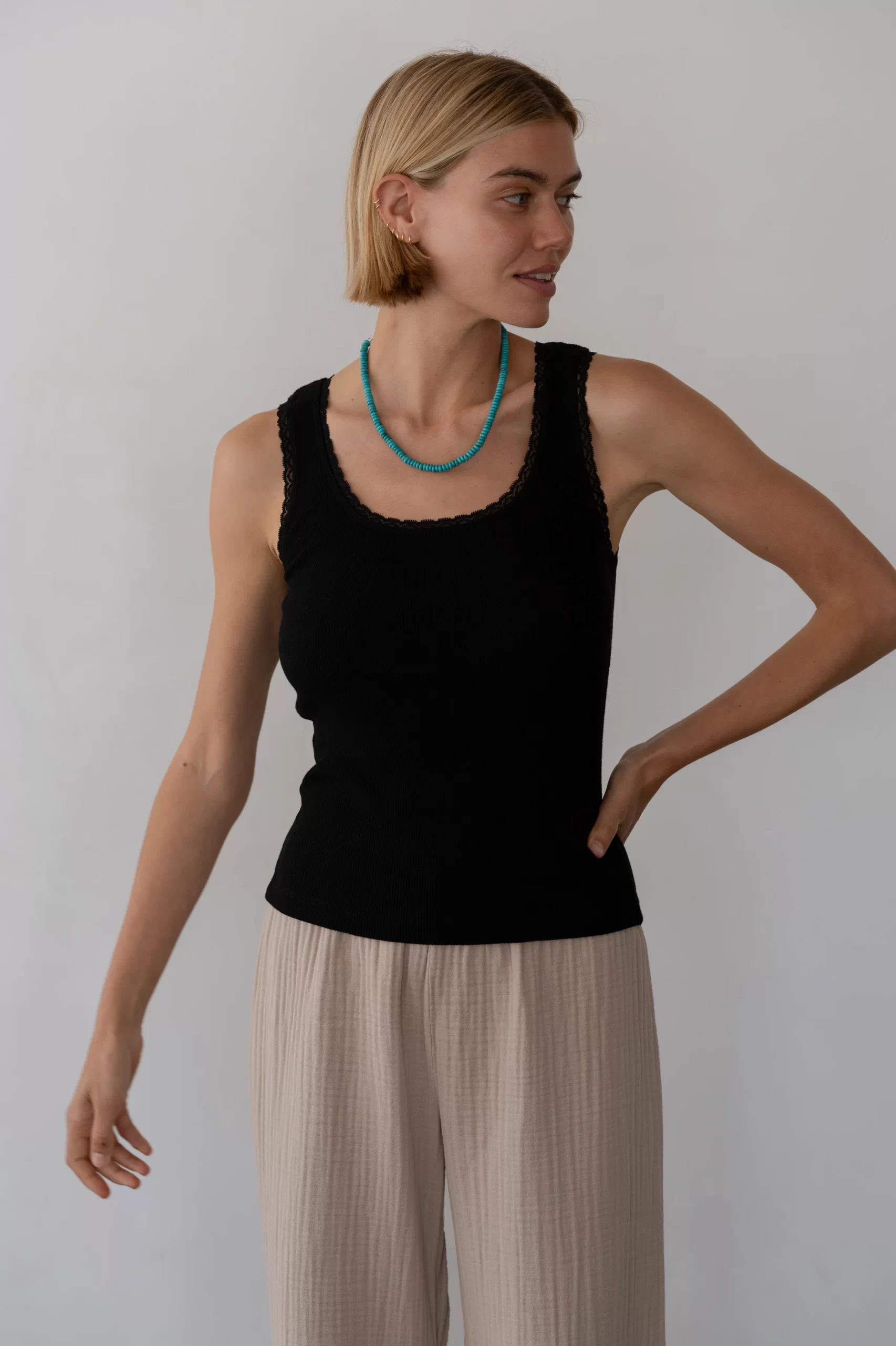 The Vintage Rib Lace Tank is crafted from 100% cotton and features ultrasoft micro ribbing, lace-trimmed edges, and a true-to-size fit for easy everyday wear.